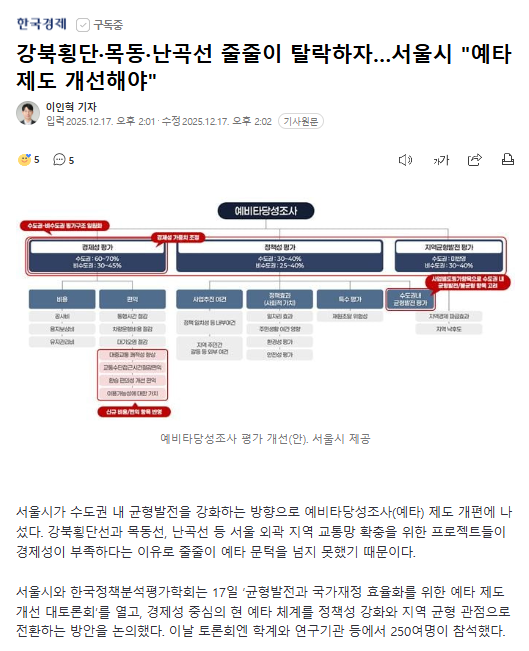 출처 : “강북횡단·목동·난곡선 줄줄이 탈락하자…서울시 “예타 제도 개선해야”, 이인혁 기자, 2025.12.17, 한국경제, https://n.news.naver.com/mnews/article/015/0005225628?sid=101”